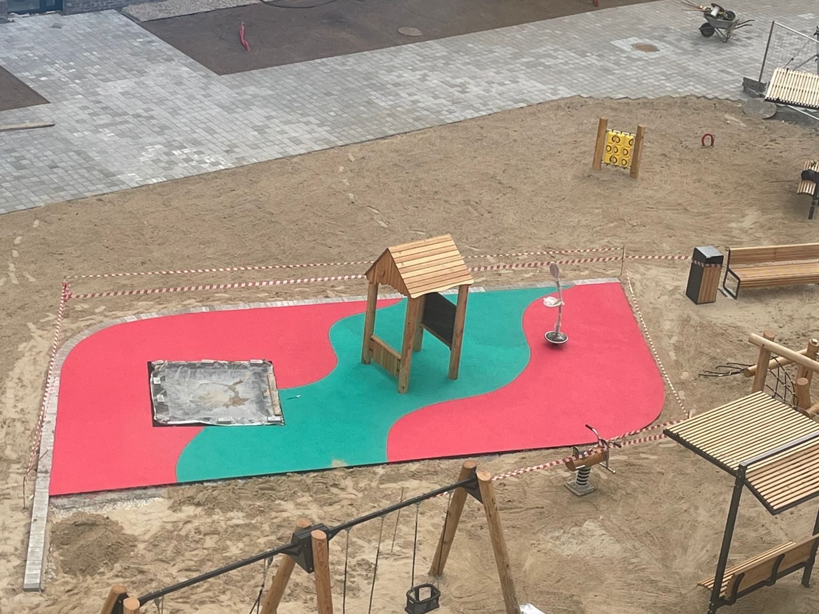 • Зонирование: на детской площадке — бесшовное покрытие в зоне качелей, плитка у песочницы.